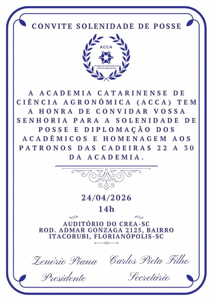A Academia Catarinense de Ciência Agronômica (ACCA) realizará, no dia 24 de abril de 2026, a posse de nove novos acadêmicos no auditório do CREA-SC, em Florianópolis (SC). Eles se somam aos 21 membros empossados em 2025, reforçando o papel da instituição de cultivar, proteger e divulgar a ciência agronômica em benefício de Santa Catarina. A ACCA caminha para completar seu quadro previsto de 40 cadeiras.